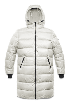 The Wayland Men's Long Reversible Puffer combines functionality and style with its reversible design, featuring premium 3-ply micro denier and lightweight Nobis Taffeta nylon fabrication. Filled with premium Canadian Origin White Duck Down, this jacket ensures maximum warmth. It includes a non-removable down-filled hood with an adjustable cord, six pockets for ample storage, and telescopic inner sleeve lining for added comfort. With an embrace membrane laminated construction, this windproof, waterproof, and breathable puffer is perfect for any weather. Machine washable and designed in Canada, it's your go-to for everyday wear.