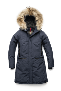 The Alissa Women's Midi Fitted Parka is crafted from premium cotton/nylon fabrication, ensuring durability and a refined look. Filled with premium Canadian Origin White Duck Down, this parka offers exceptional warmth for chilly days.