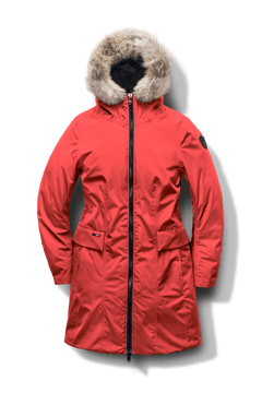 This hooded parka is a flattering pick for below-freezing winter days. It features a seam-sealed Durable Water Repellent outer layer with our exclusive Embrace laminated interior membrane to keep you dry, along with premium duck down fill in the body and hood for superior warmth. On the inside, you'll find two interior chest pockets and a hidden draw cord at the waist for a customized fit. Adjustable button cuffs help lock in heat, while exterior flap and side entry pockets offer easy access to your essentials.
