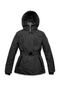 Made from premium 3-Ply Micro Denier fabric and insulated with Canadian Origin White Duck Down, this jacket offers exceptional warmth. The non-removable down-filled hood, removable belt, and telescopic inner sleeve lining provide both style and versatility. With Embrace membrane lamination and seam-sealed construction, it is windproof, waterproof, and breathable. Designed to withstand the elements while maintaining a tailored fit.